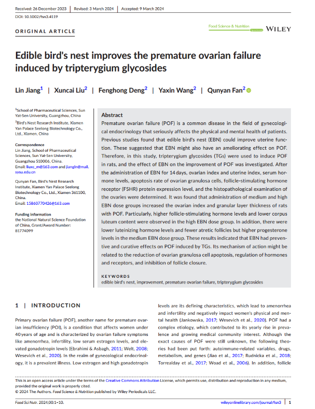 燕之屋再添科研成果,與其出色的技術(shù)水平、創(chuàng)新能力密不可分。一直以來,燕之屋秉持“源于天然,美與健康”的理念,自建燕之屋燕窩研究院,夯實基礎(chǔ),守正創(chuàng)新,不斷挖掘燕窩營養(yǎng)功效,為行業(yè)高質(zhì)量發(fā)展獻智獻力。2023年,燕之屋關(guān)于“Effect of edible bird’s nest and N-acetylneuraminic acid on gut microbiota in different stages of pregnant rats fed with zinc deficient diet”的研究成果被食品科學(xué)領(lǐng)域國際知名SCI期刊《Food Bioscience》收錄;2023年,燕之屋燕窩研究院通過體外生化、細(xì)胞、生物三維立體證實了燕窩肽的抗衰老功效,并在國際權(quán)威期刊《Journal of Functional Foods》發(fā)表了燕窩肽抗衰研究“Study of the antiaging effects of bird's nest peptide based on biochemical, cellular, and animal models”,揭示燕窩肽抗衰老功效,進一步彰顯燕之屋科研實力。